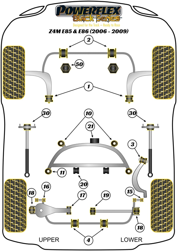 POWERFLEX Black Series bushes are manufactured using our Black 95 Shore A compound to provide maximum control of chassis geometry. They are designed for the Track, ready to Race and are engineered to be the best. This compound can be up to 80% more resistant to load than standard rubber and 25% stiffer than our purple performance material. If your requirements are purely for the ultimate in handling and chassis performance then Powerflex Black Series are unique, offering the most precise and accurate alignment for your chassis.